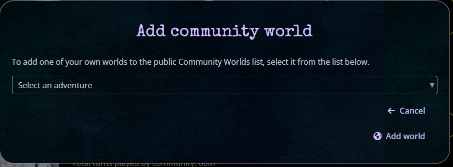 The second way to share your world in Infinite Worlds is to share it with the community. This will add it to the list of searchable worlds on the front page and give you a permanent link to share (see above). To do this, find the button labeled "Add Community World" located at the bottom of the front page: