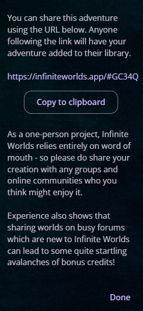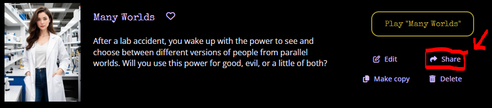 There are two ways to share your Infinite Worlds adventure with others: sending a direct link and adding to Community Worlds.